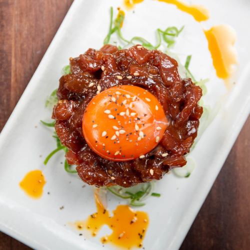 新鮮な馬刺し、白ごま、大葉、そしてユッケのタレをかけた常連様に大人気のメニューです。新鮮な馬肉だからこそできる馬肉ユッケをぜひ味わってみてください。